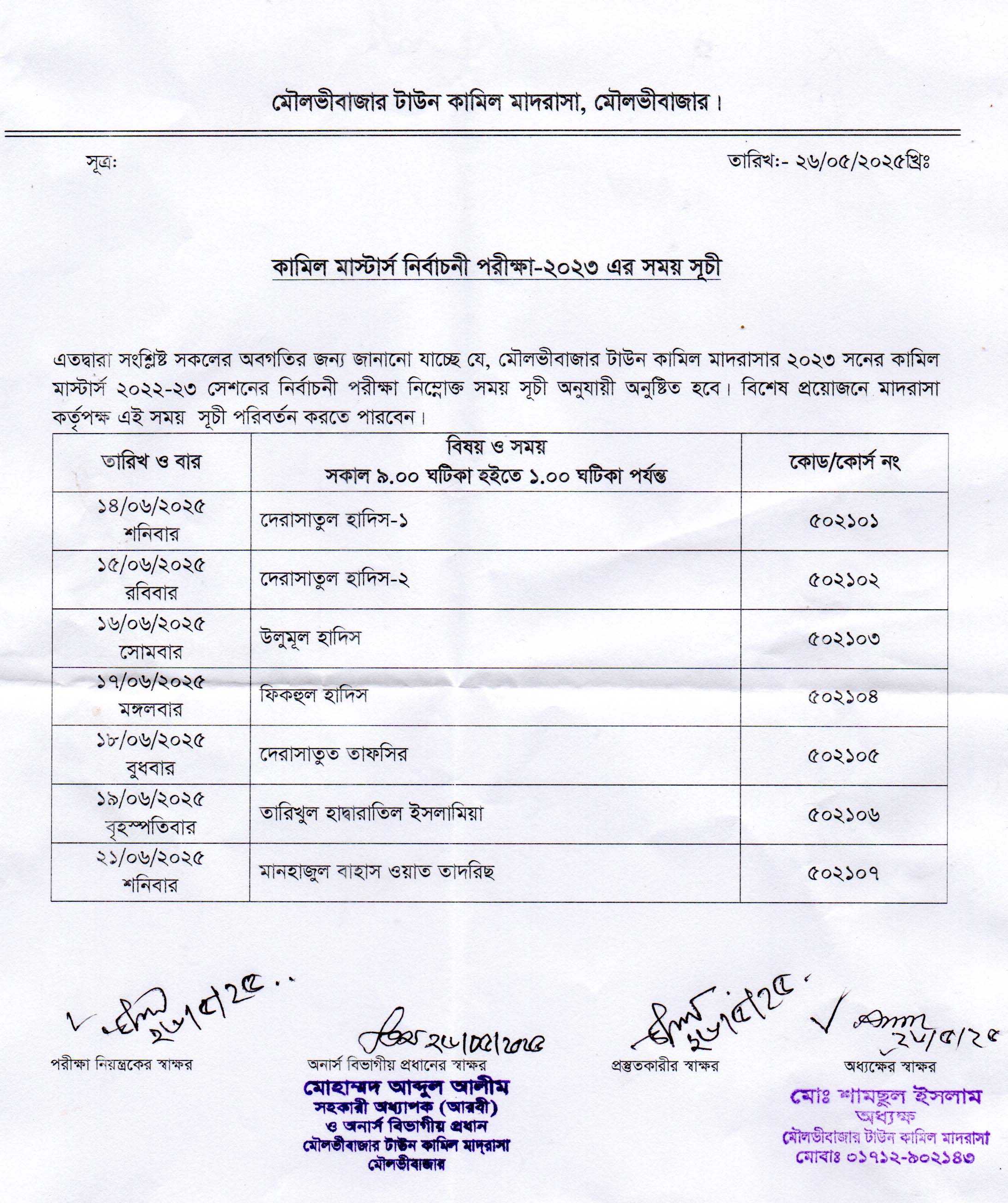 কামিল মাস্টার্স নির্বাচনী পরীক্ষা-২০২৩ এর সময় সূচী