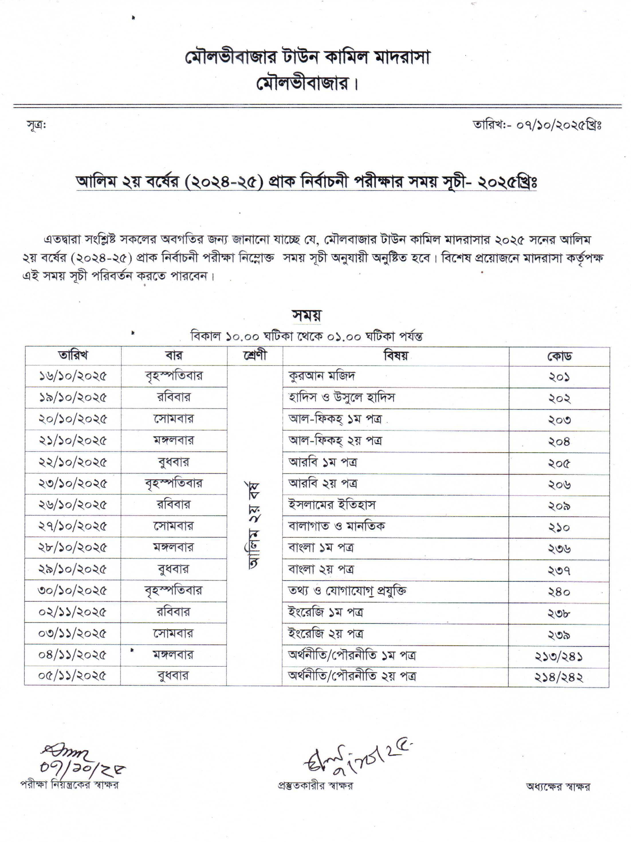 আলিম ২য় বর্ষের (২০২৪-২৫) প্রাক নির্বাচনী পরীক্ষার সময় সূচী- ২০২৫খ্রিঃ