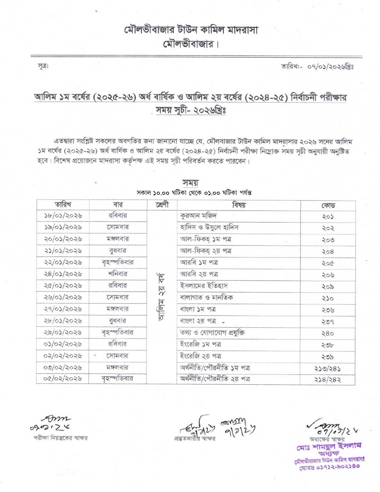 আলিম ১ম বর্ষের (২০২৫-২৬) অর্ধ বার্ষিক ও আলিম ২য় বর্ষের (২০২৪-২৫) নির্বাচনী পরীক্ষার সময় সূচী- ২০২৬খ্রিঃ